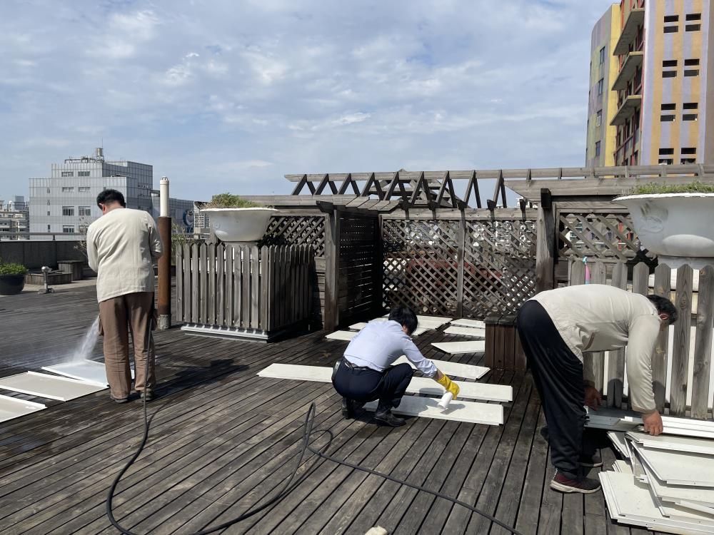 為清洗大樓內(nèi)所有公共過道吊頂,4月中旬,工程部師傅們開始拆下4樓公共過道吊頂,保潔部阿姨們則負責集中清洗,在工程和保潔的井然有序的共同配合下,目前已經(jīng)完成了4樓局部過道吊頂?shù)那逑垂ぷ?。后續(xù),將按照計劃進度在6月進入梅雨季之前,陸續(xù)完成全部樓層的吊頂清潔。
