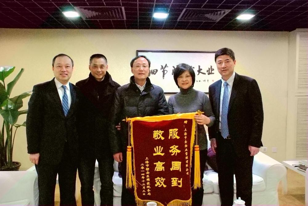 12月8日下午,由我司提供物業(yè)服務(wù)保障的靜安區(qū)稅務(wù)局領(lǐng)導(dǎo)一行來(lái)到公司,代表靜安稅務(wù)局向朱建華董事長(zhǎng)送上了鮮紅的錦旗,感謝中企物業(yè)服務(wù)團(tuán)隊(duì)的優(yōu)異表現(xiàn)并贊揚(yáng)物業(yè)服務(wù)是靜安稅務(wù)的堅(jiān)實(shí)保障。