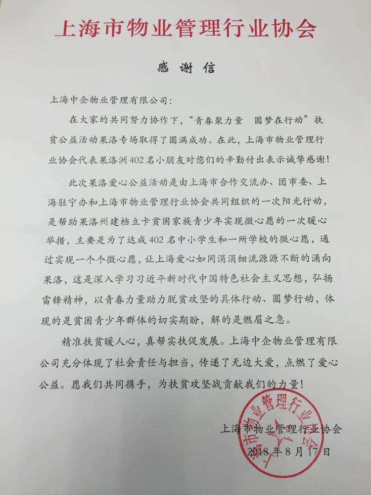 日前,中企物業(yè)參與了由共青團(tuán)上海市委、青海省果洛藏族自治州人民政府、上海市人民政府合作交流辦公室領(lǐng)導(dǎo),上海市人民政府駐西寧辦事處、上海市援青干部聯(lián)絡(luò)組、共青團(tuán)上海市合作交流工作委員會、上海市慈善基金會、上海青年志愿者協(xié)會聯(lián)合舉辦的青海省果洛藏族自治州專場“青春聚力量、圓夢在行動”公益扶貧活動,青海果洛州專場聚焦當(dāng)?shù)?02名困難學(xué)生,為他們實現(xiàn)微心愿。中企物業(yè)作為行業(yè)領(lǐng)先企業(yè),充分體現(xiàn)了社會責(zé)任與擔(dān)當(dāng),用實際行動為果洛州402名小朋友獻(xiàn)出愛心,或許只是一個書 包、一套復(fù)習(xí)資料、一個足球、一套運動服,但我們相信點滴匯聚必成大愛,希望果洛州的孩子們把小小愛心埋于心中,健康快樂地慢慢長大。