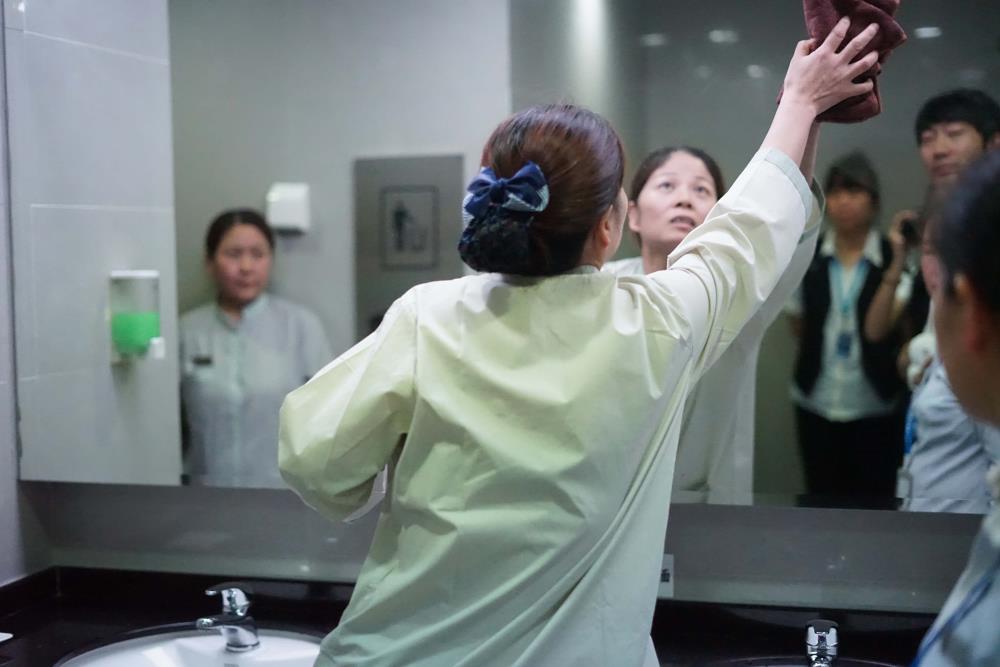 在衛(wèi)生間保潔區(qū),選手除了分清干濕毛巾的規(guī)范使用,還要觀察門縫、烘手機、開關(guān)等衛(wèi)生死角是否積灰,從細(xì)微差別處看“貼心”;在機器操作區(qū),大家熟悉擦地機的操作流程還不夠,如何輕松運用才是難點,有選手遇到機器半路“卡殼”的情況,經(jīng)驗豐富的考官現(xiàn)場對其進(jìn)行了耐心指導(dǎo),提高大家的業(yè)務(wù)能力;在玻璃保潔區(qū),清潔刮刀首先出場,抹布擦拭進(jìn)行收尾,選手們在極短的時間內(nèi)就能交出漂亮答卷,專注的神情甚至吸引了馬路上行人的矚目。在樓層保潔區(qū),選手們從貼腳線清理、地板擦拭到講述樓道死角的打掃經(jīng)驗,每一個環(huán)節(jié)都是對選手的考驗,只有帶上“放大鏡”進(jìn)行清理,才算得上真正的服務(wù)到位。