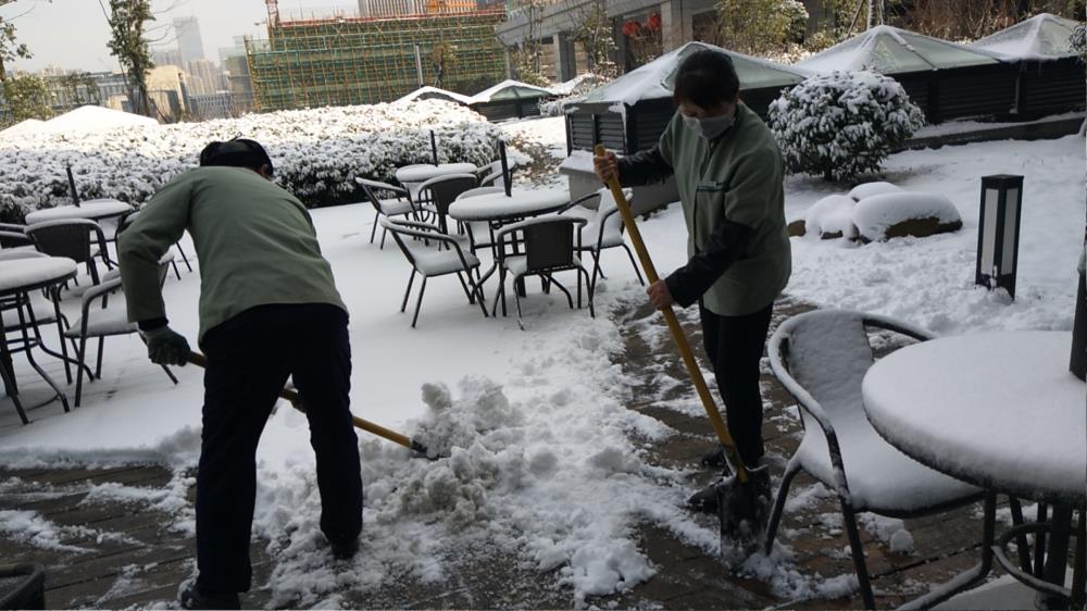 有那么一群人,戴著口罩,鏟著積雪,始終在堅守。他們不分崗位,不分職責,是這次戰(zhàn)場上的絕對主力。甚至在午夜,我們依舊可以看到他們的身影穿梭在樓宇之間,背著水箱噴灑藥劑。工作量成倍增加,卻不曾有人多一句怨言,他們就是事業(yè)部所有奮戰(zhàn)在現(xiàn)場的一線員工,他們在合肥,他們在揚州。