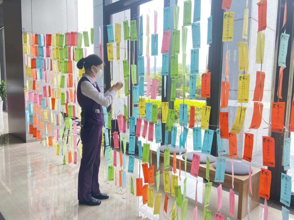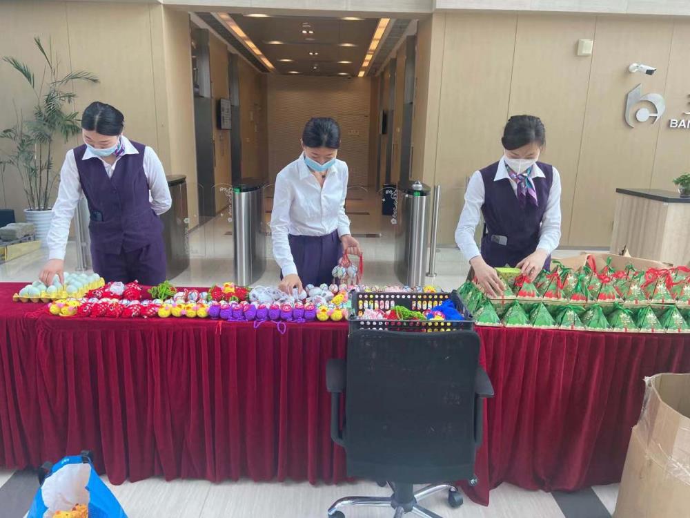 交通銀行揚(yáng)州金融服務(wù)中心物業(yè)服務(wù)處的物業(yè)小姐姐們?cè)诒U蠉徫还ぷ鞯那闆r下,利用兩天時(shí)間,完成了1200只粽子的包裝、1000只鴨蛋的裝網(wǎng)以及1500條五彩繩的編織。6月11日中午安排進(jìn)行派發(fā),整個(gè)園區(qū)瞬間洋溢出了濃濃的節(jié)日氛圍,不少客戶不禁舉起手機(jī)合影、拍照,分享這份“五彩斑斕”的節(jié)日驚喜!