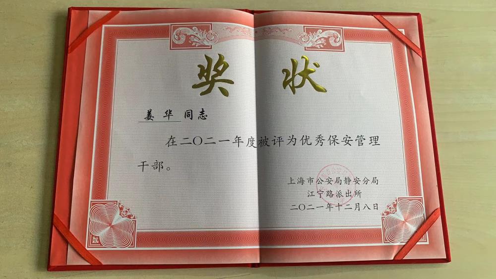 創(chuàng)展大廈物業(yè)服務(wù)中心保安主管姜華始終秉持嚴(yán)謹(jǐn)細(xì)心的敬業(yè)工作,以及確保安全管理落實(shí)到位的責(zé)任意識(shí),12月7日獲上海市靜安區(qū)江寧路派出所頒發(fā)的“2021年度優(yōu)秀保安管理干部”獎(jiǎng)狀。
