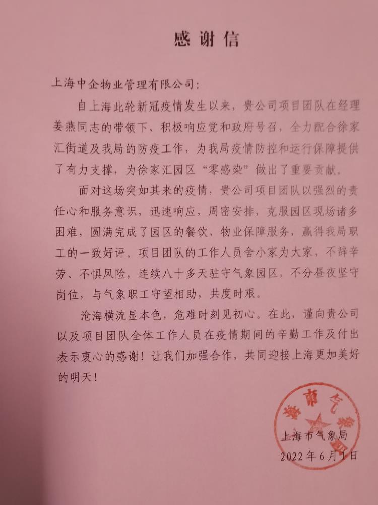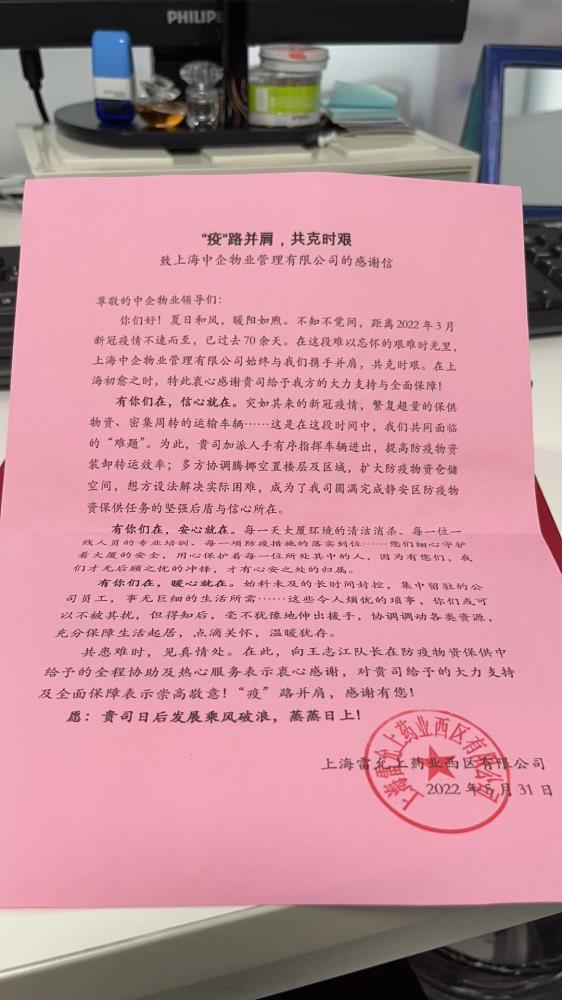 對于中企人來說,物業(yè)人不僅要保障項目安全,也要盡己所能守護客戶的安心。經(jīng)歷上海此次前所未有的靜默封控,每個人都對生活或許有了不一樣的感悟,從封控的焦慮和迷茫中走出來,重新精神飽滿、充滿希望地再次擁抱生活也是物業(yè)人由衷的祝愿!
