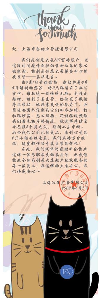 疫情封控2個月后,創(chuàng)展大廈全面重啟,恢復(fù)了往日白領(lǐng)們進進出出,熙熙攘攘。6月7日,一封粉色,印有貓咪的電子信函“滴滴”發(fā)送到了物業(yè)服務(wù)中心的郵箱——來自大廈727室客戶的這封表揚信中,字里行間都充滿了對保安主管姜華的感謝!
