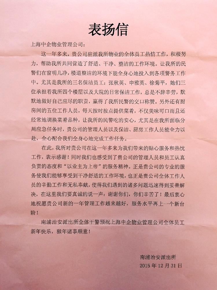 新年伊始,公司收到了來自黃浦公安分局下屬南浦治安派出所的一封表揚(yáng)信,高度贊揚(yáng)了我司物業(yè)服務(wù)保潔員工和廚房工作人員,全心配合、熱忱工作、貼心服務(wù),為南浦所民警提供了舒適、整潔的工作環(huán)境,為干警提供了安心、可口的工作午餐,感受到我司物業(yè)工作人員“以業(yè)主為上帝”認(rèn)真負(fù)責(zé)的服務(wù)精神,感謝物業(yè)工作人員一年的辛勞和付出,祝愿我司新的一年管理工作越來越好,服務(wù)水平再上一個(gè)臺(tái)階。