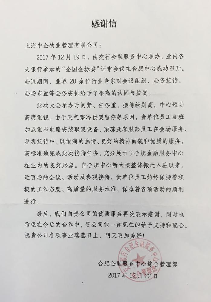 信中寫到:“2017年12月19日在交行金融服務中心承辦、業(yè)內各大銀行參加的“全國金標杯”評審會議期間,物業(yè)服務中心團隊精心組織會議、熱情周到接待、井然有序的會場布置”,交行金融服務中心綜合部領導給予了高度認可和贊賞。