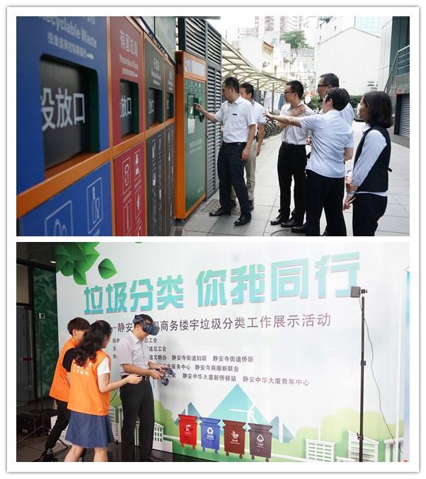 活動現(xiàn)場,垃圾分類志愿者招募、垃圾分類科普繪本、夏日消暑美食等應有盡有,譚振勇副主席在中企物業(yè)資產(chǎn)管理事業(yè)部總經(jīng)理劉真清陪同下蒞臨現(xiàn)場,親自體驗了一把VR垃圾分類小游戲。隨后,一行人參觀了靜安中華大廈的樓層垃圾分類間,到配備濕垃圾生化處理機的垃圾設(shè)備房對“餐廚廢棄物資源化利用”項目進行實地了解。