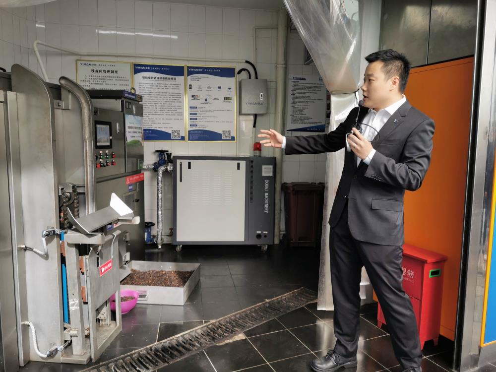 考察團一行參觀了位于靜安中華大廈后門處的垃圾收集分類站和大樓樓層里的垃圾房,中企物業(yè)總經(jīng)理嚴鑌賢現(xiàn)場介紹了分類站的“高級功能”。除了一臺設(shè)有干垃圾、有害垃圾、可回收物等不同種類垃圾投遞窗口的智能垃圾分類回收設(shè)備外,還特別配備了一套智能濕垃圾處理設(shè)備,通過進料、壓縮、排水、烘干處理后,就能成為有機肥料。在樓層垃圾房內(nèi),則分別放置了一個60升的濕垃圾桶、一個100升的干垃圾桶、一個100升的可回收垃圾桶和一個用于投放有毒有害垃圾的小簍子。此外,中企物業(yè)還貼心地為每個垃圾房安裝了一個洗碗池,方便自己帶飯的白領(lǐng)洗碗,細致之處,彰顯優(yōu)質(zhì)服務(wù)和高效管理。