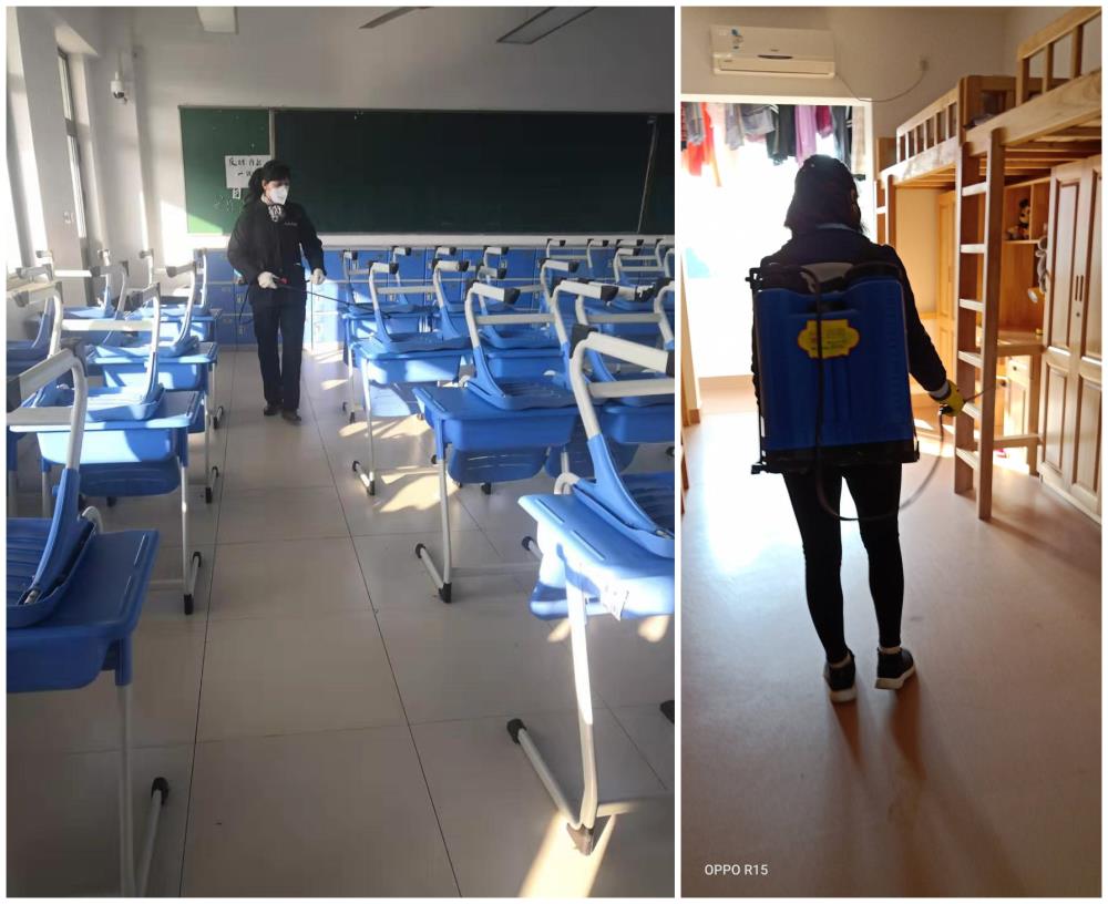 保潔的工作往往會被大家忽視,但他們卻默默地、安靜地守護著學校的一方凈土。防疫期間,保潔領班對所有的保潔人員進行了系統(tǒng)的疫情防控防范培訓,我們用含氯消毒噴灑、擦拭的方式,定期對教室、宿舍、食堂、會議室等場所進行消毒、通風,包括走廊扶手、門把手等各個細小的角落。